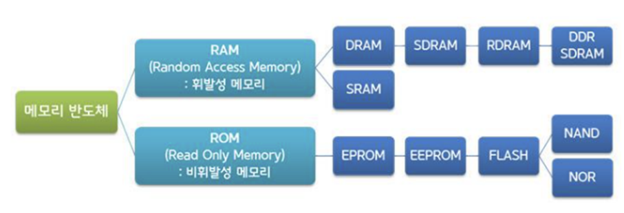 메모리 반도체는 데이터와 정보를 저장하는 데 사용된다. 대량 생산이 가능하고 가격이 비교적 저렴합니다. 메모리 반도체는 기기 전원을 끄면 정보가 사라지는지에 따라 크게 램과 롬으로 나뉜다. RAM은 휘발성이며, 비교적 빠른 데이터 검색 속도를 특징으로 하며, 기기의 전원이 꺼지면 저장된 정보가 사라집니다. ROM은 비휘발성 메모리로, 전원이 꺼질 때에도 정보를 계속 저장합니다. RAM은 컴퓨터의 RAM이고 SSD HDD는 ROM입니다.