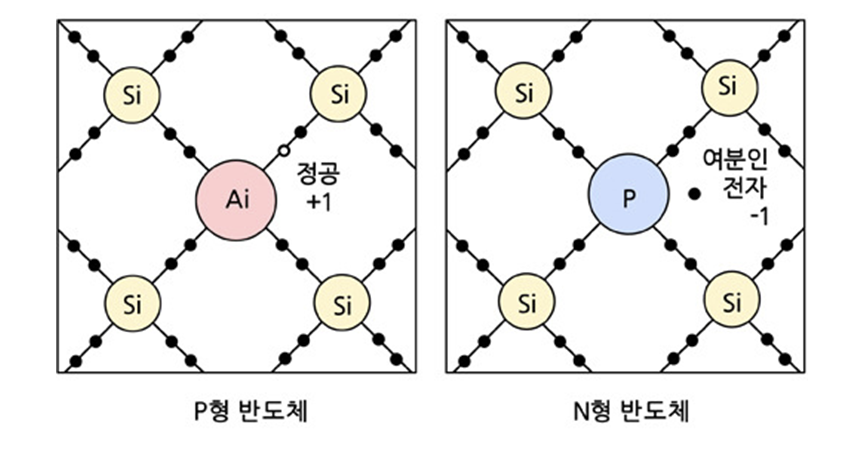 그래서 저는 도핑을 할 것입니다. P형 반도체에는 13족 원소가 도핑되어 구멍이 생기고, n형 반도체에는 15족 원소가 도핑되어 자유 전자가 만들어진다. 이 구멍들과 자유 전자들은 전하를 운반하는 운반체가 된다. 전류가 흐를 수 있습니다.