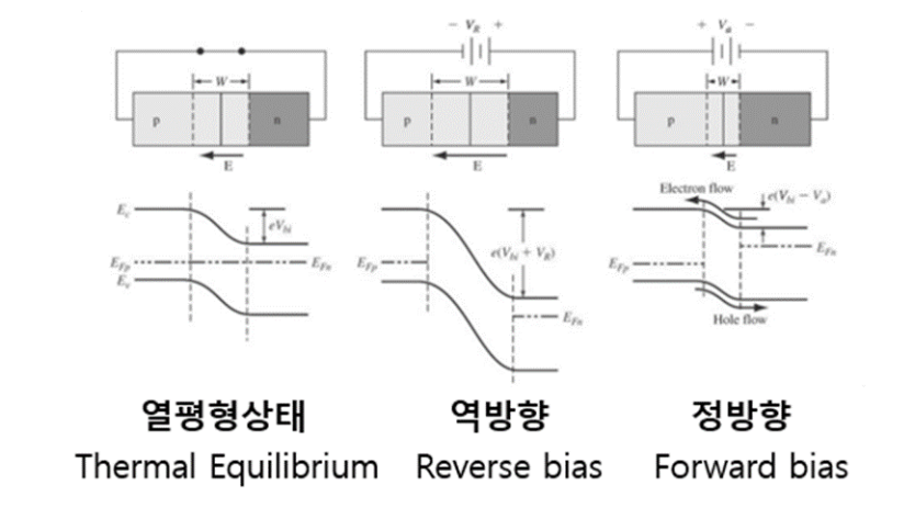 이 p형과 n형 반도체를 합치면 열평형이 된다. n형 전자는 확산에 의해 p형으로 이동한다. 그리고 구멍은 n형 쪽으로 이동합니다. 움직이는 구멍과 전자는 전기장을 만듭니다. 확산에 의한 힘과 전계에 의한 힘이 같아질 때까지 확산한다. 그리고 가운데에는 사진에서 볼 수 있듯이 퇴적구역이 있습니다. Deletion 영역에서는 +에서 -로 전기장이 생성됩니다. 전자를 보면, 전자가 이동하려고 합니다